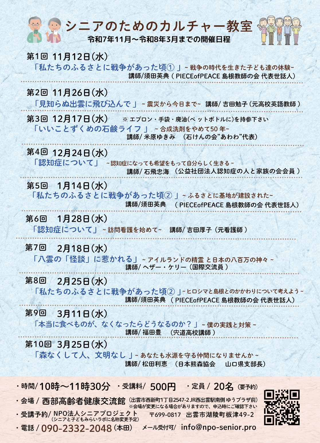 A.シニアプロジェクトでは、皆さんがお住まいの地域への出前講座も承っていますので、お気軽に問い合わせ下さい。